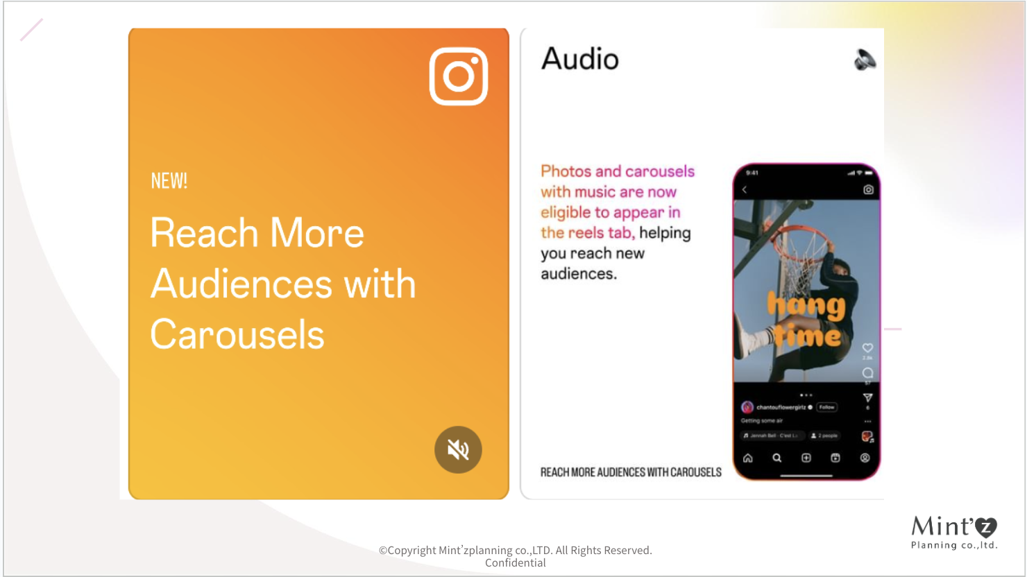 リールタブにカルーセル投稿が表示されるようになったことで、カルーセル投稿でも新規ユーザーへのリーチが可能となり、より多くのリーチが見込めるようになります!