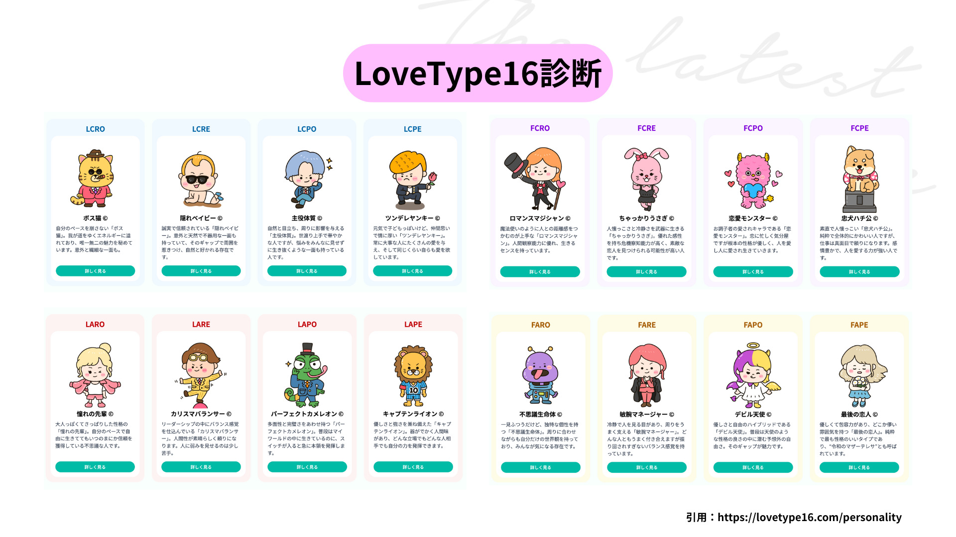たとえば「FCPE=忠犬ハチ公(Follow・Cuddly・Passionate・Earnest)」や「LARO=憧れの先輩(Lead・Accept・Realistic・Optimistic)」など、タイプごとに個性豊かなキャラクターが設定されています。