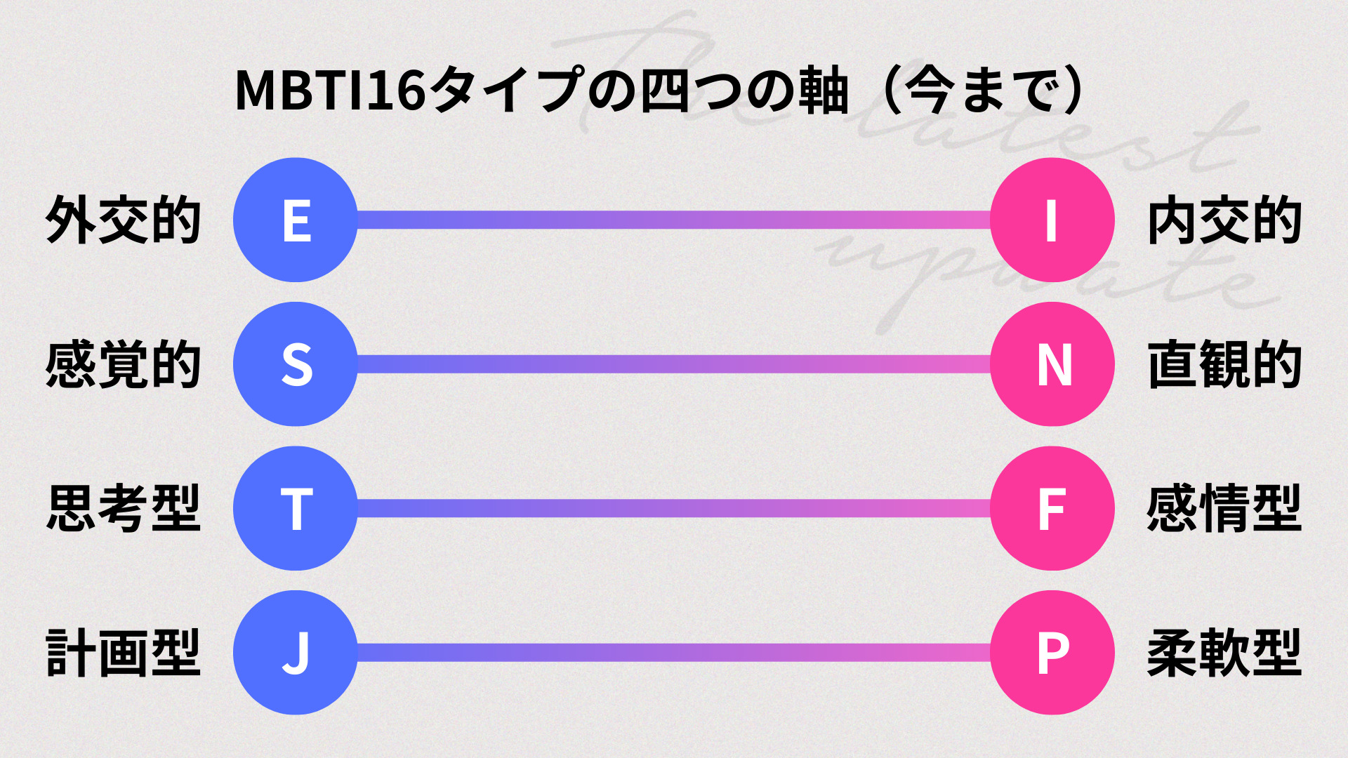 この4つの組み合わせにより、従来のMBTIは16タイプに分類されてきました。