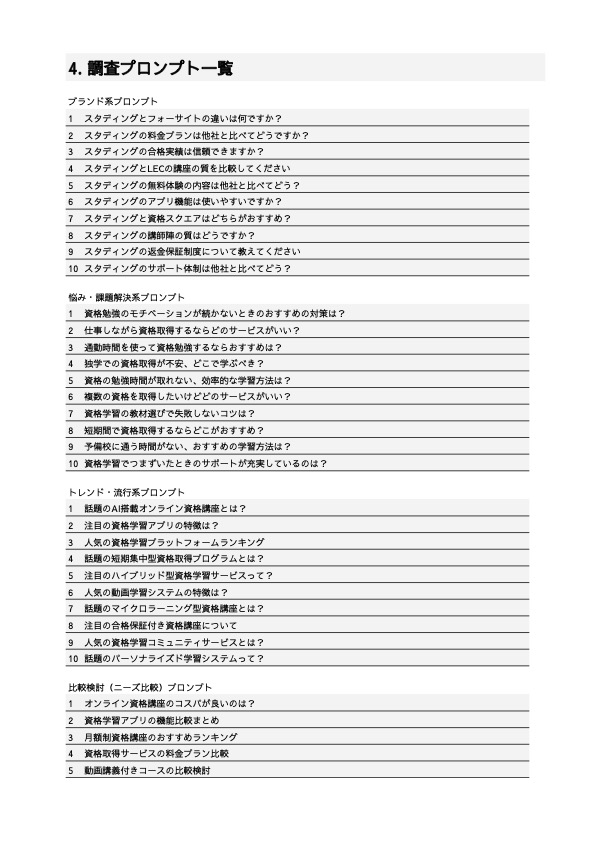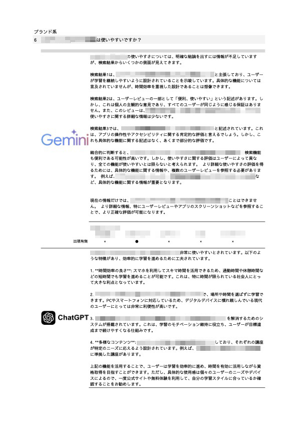 特定のブランドやサービス名、あるいはカテゴリーを指定いただければ、その条件に基づいた調査を実行します。自社の現状把握だけでなく、競合他社がどのような文脈でAIに推奨されているかを分析する目的でもご活用いただけます。