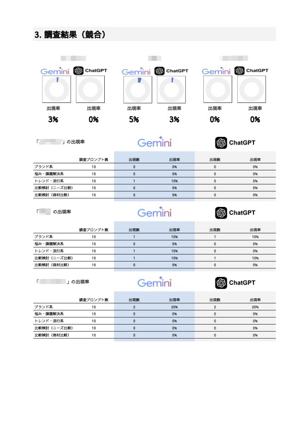 自社ブランドだけでなく、あらかじめ指定した競合他社の出現率も同時に算出します。競合の出現率を把握することで、LLMO対策における自社の立ち位置を客観的に評価することが可能です。